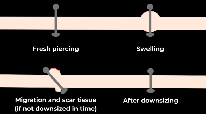 Papuošalų dydis mažinamas, kai nuslūgsta pradinis šviežio vėrimo patinimas, kad būtų išvengta traumų ir migracijos. Ši procedūra paprastai atliekama per 2–4 savaites nuo vėrimo, o tikslus laikas priklauso nuo konkretaus auskaro. (Jei auskaras pradeda migruoti, tai yra negrįžtama ir gali prireikti jį išimti. Retais atvejais, kai migracija minimali, yra galimybė, kad auskaras sugis)