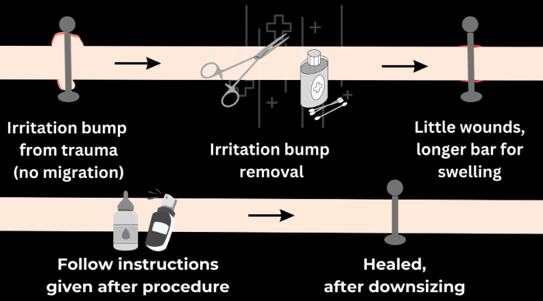 2022 metais suradau savo metodą atlikti šiai procedūrai ir patobulinau priežiūrą, reikalingą optimaliems rezultatams pasiekti. Dėl to granulomų gydymo trukmė žymiai sutrumpėjo. Nepaisant to, svarbu elgtis labai atsargiai, kad būtų išvengta bet kokio atsitiktinio kontakto, auskarų judinimo ar užkabinimo, kad visiškai nereikėtų šios procedūros.